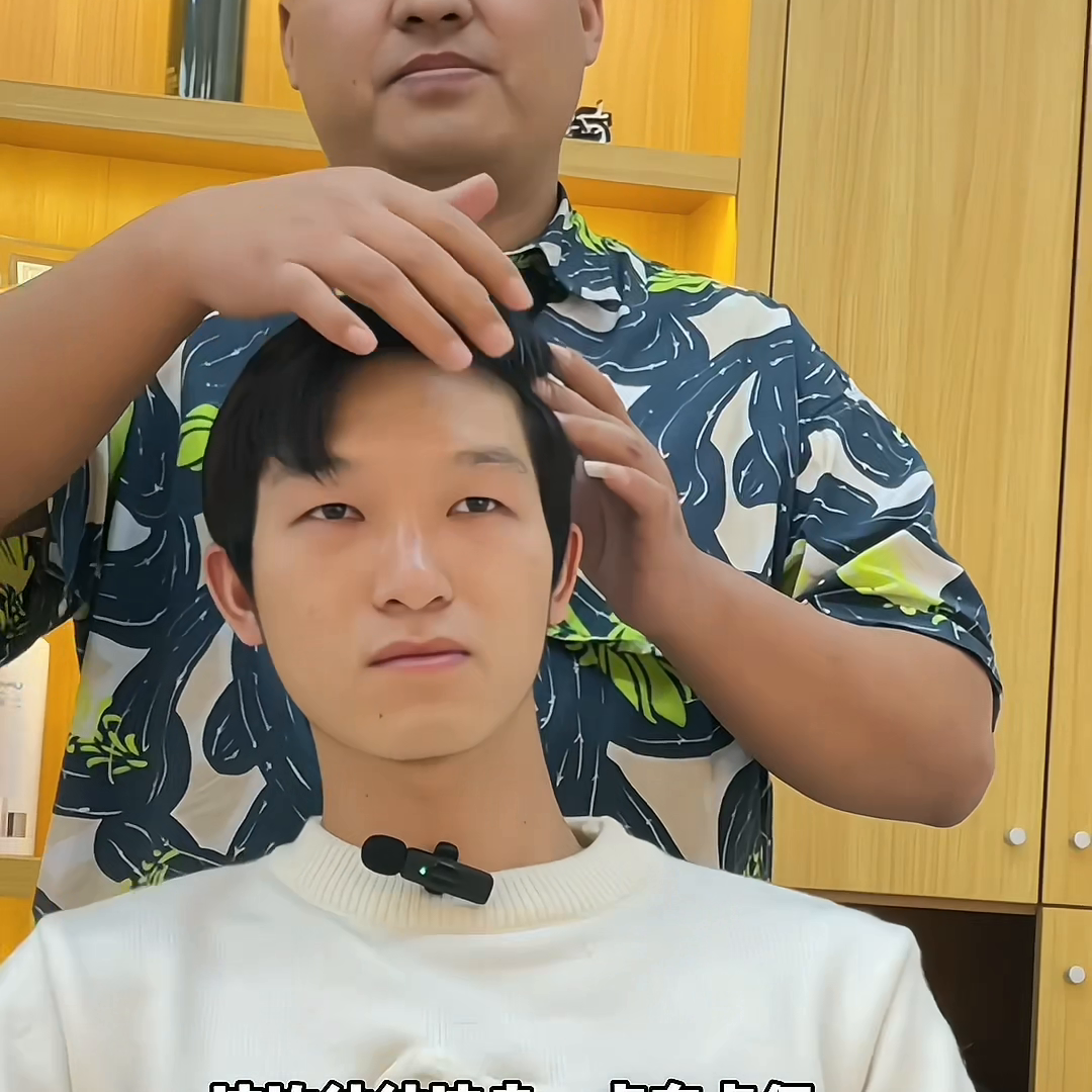 这边往往这走一点有点偏,港风或者有点偏韩式的那种。平常你自己在家的时候,稍微一吹就可以了,两侧就不建议你剪太短了。因为你脸型偏瘦,如果剪的太短,会显得你的脸型太长了。