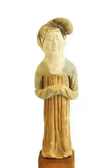 堕马髻,东汉桓帝时期,外戚梁冀的妻子发明的一种发型,这种发型在西域也很流行,梳头方法是将头发在头顶梳成一个似坠非坠,偏向一侧的大髻,形成一种不稳定的动态感,因为看上去像从马上刚刚摔下来,所以叫堕马髻,后经历代传承,不断演变,至在唐天宝年间又开始流行。阿斯塔那336号墓出土的一尊女立俑,梳的就是这种发型。