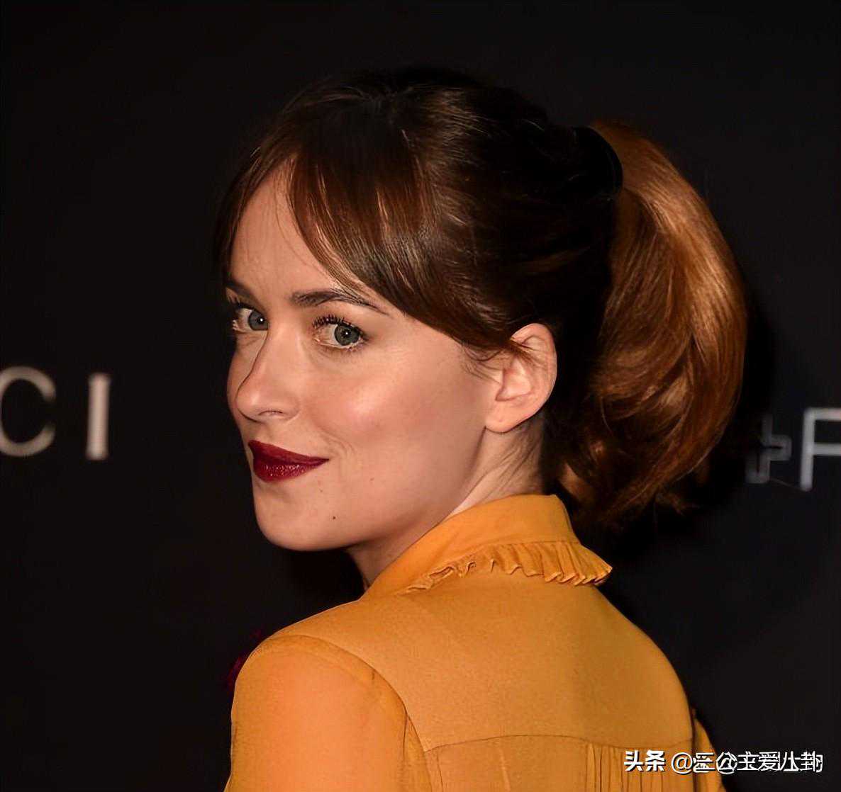 短发并不意味着你不能享受盘发的乐趣!达科塔·约翰逊以其标志性的浓密、凌乱的头发和刘海而闻名,她把她的短发扎成有弹性、光滑的马尾辫,搭配爆炸的刘海,打造出优雅可爱的外观。
