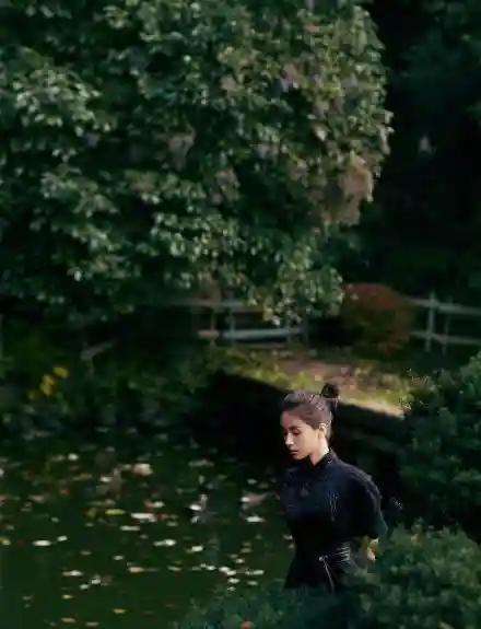 照片中的王子文化身一位气质美女站在有树有湖的风景里,头发一丝不苟地盘起,不遗余力地将她的五官展现出来。