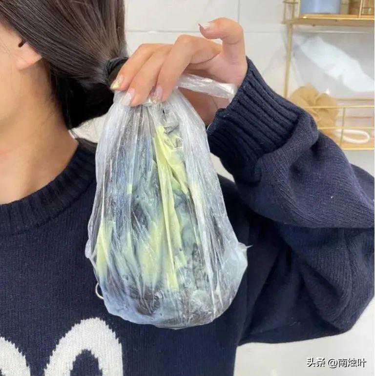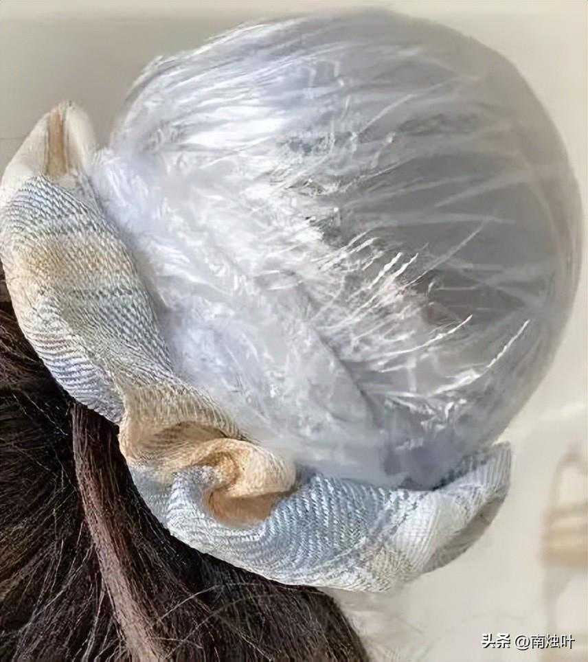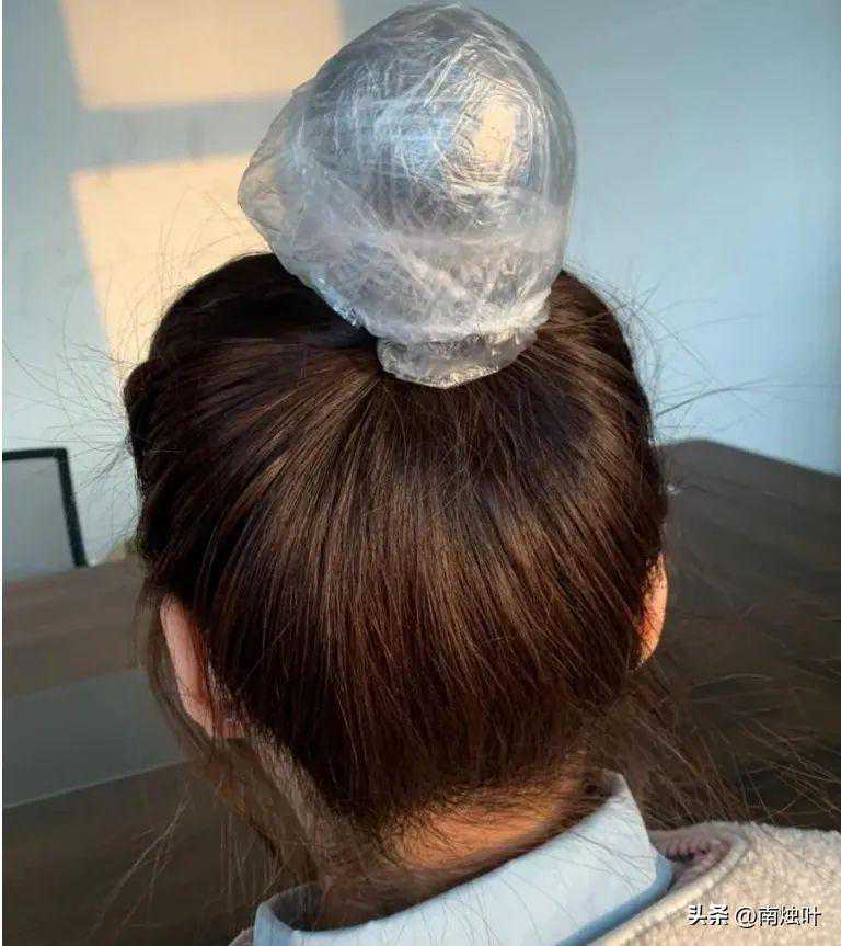接着可以把保鲜膜/塑料袋包紧,把掉下来的话可以将被保鲜膜/塑料袋覆盖的头发扎成丸子头。