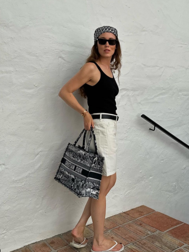 喜欢造型多变的女人可以添加一些配饰,只要搭配得当就能让你散发不一样的光芒。像这身极简造型,黑色背心+白色短裤+白色夹脚拖鞋,非常随性简单,而最突出的地方就是这款浪漫大波浪,搭配花色头巾,在墨镜的加持下,散发出独有的时髦感。