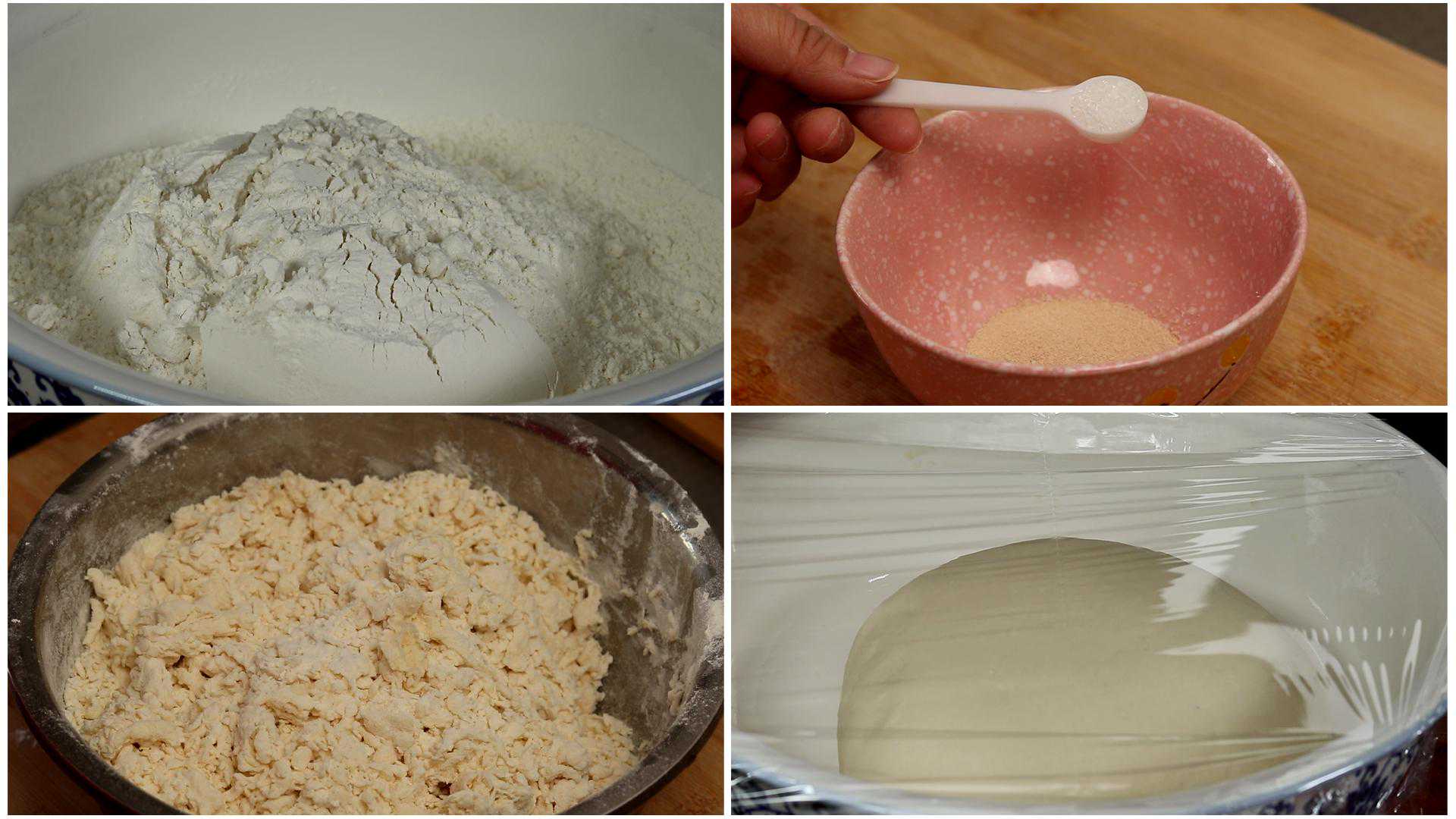 1.不管是蒸馒头还是包子,发面是特别重要的一步,盆里面倒入两斤面粉,再准备一个空碗,碗中加入5克酵母粉,一勺白糖加速酵母的发酵,然后加入温水,温水一定要在35度左右,这是酵母粉醒发最适合的温度,温度太低,酵母菌活性也会变低,导致醒发不起来,温度太高,酵母菌会被烫死,将酵母化开,然后往面粉里一边倒入酵母水,一边用筷子搅拌,用温水先将酵母粉化开再和面,这样可以使面醒发的更快些,直到搅拌成没有干面粉的面絮状,接下来开始和面,用手揉成面团,刚开始揉的时候很难揉光滑,我们可以盖上盖子,让面团先松弛5分钟,5分钟以后再继续揉搓面团,大约揉10分钟,这样面团就非常光滑了,然后盖上盖子把面团放到温暖的地方,让面团醒发至两倍大。