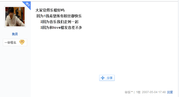 哈哈哈,大家可千万不要误会魏晨,其实他是很宠粉的。就拿他的粉丝“乐橙”名字来说吧,这个名字是当年魏晨还在参加选秀的时候自己为粉丝取的,他说:“我希望所有粉丝都快乐,因为音乐我们走到一起,因为和love橙发音差不多。”是不是心很细?