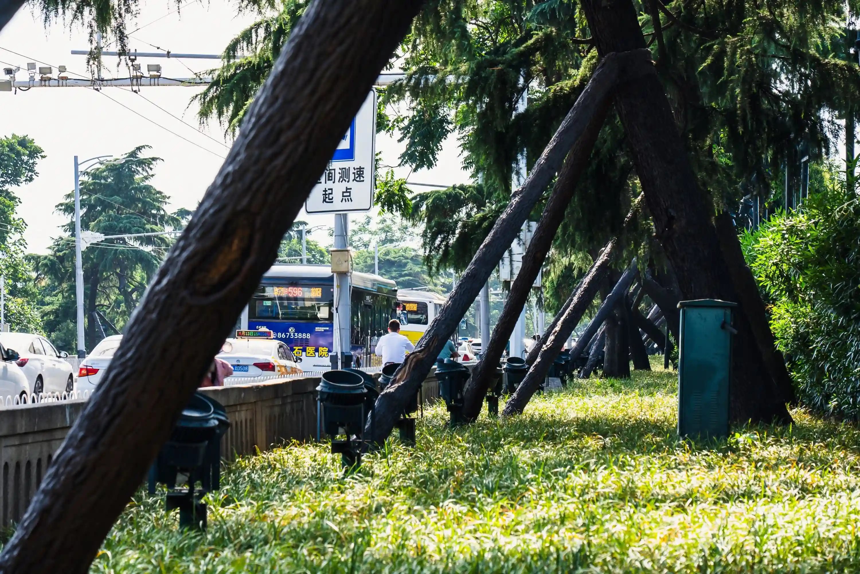 由于江上风大,这批雪松大部分倾斜严重。2008年,市园林和林业局为其中35棵安装了支撑架;2017年、2021年,市园林和林业局、武昌区城管执法局分别对倾斜雪松的支撑架进行了翻新、加固和更新。目前,共有44株雪松安装了绿色钢管支撑,但这些支撑架造型简单、生硬,与周边景观不太协调。