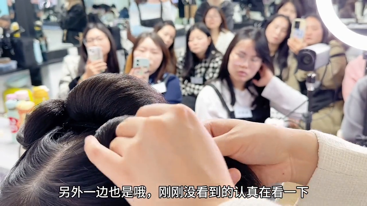 ·先分取一撮头发梳顺,准备绕一个结,注意看注意看,我表达不出来,要认真看。绕好之后用U型夹固定发片,剩下的发尾藏在头发下面,用夹子固定起来。另外一边也是,刚刚没看到的认真再看一下,你看我们的同学是不是都在认真学习,发尾收起来。
