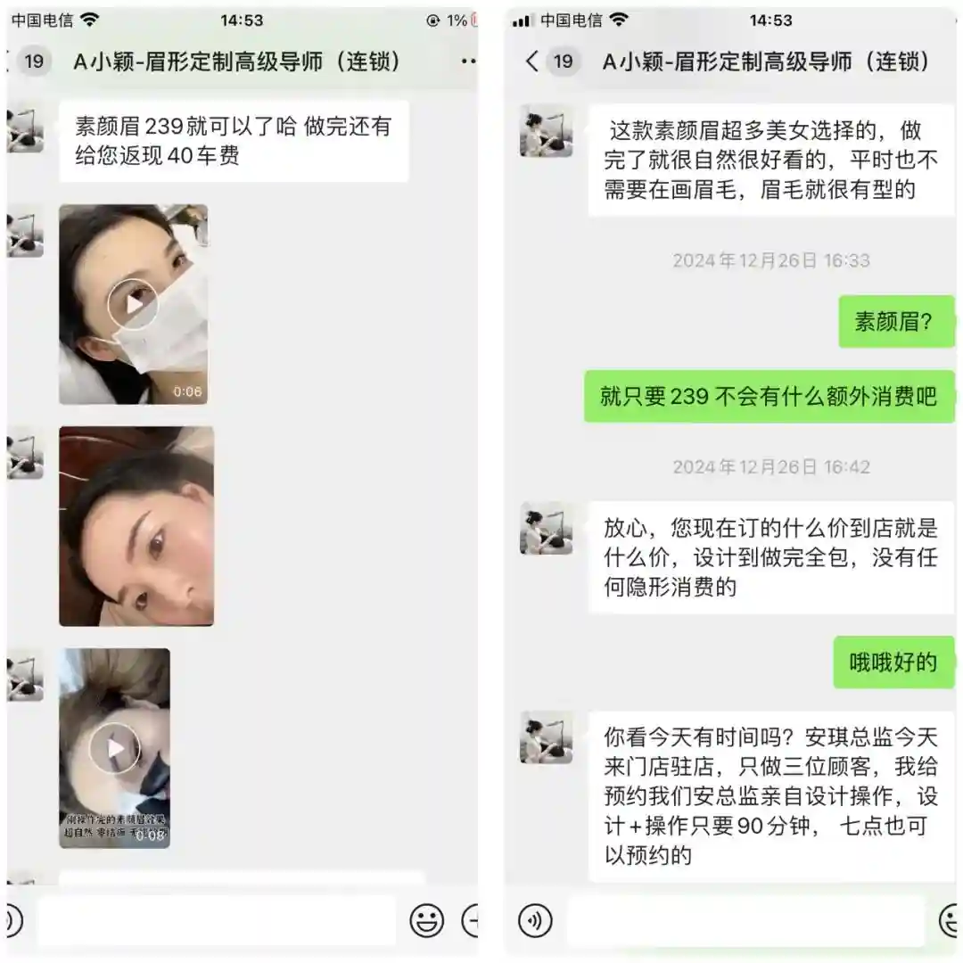 △前期沟通中,麦女士反复确认了纹眉项目的收费。客服人员表示,到店付239元即可,且由总监老师亲自操作。