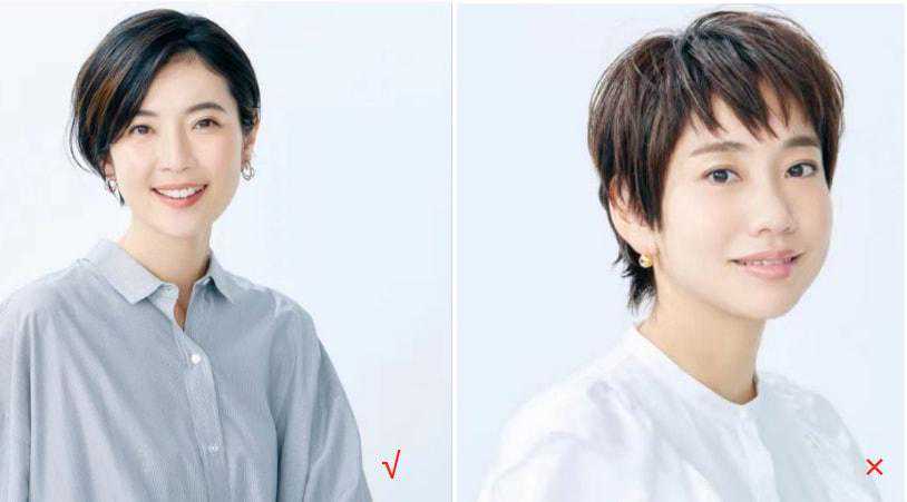 像圆脸、脸大的女性,比起有刘海,无刘海的发型会更显气质,因为刘海会让脸型看上去更加圆润显得脸大。看这位妈妈的前后对比就比较明显,前者略显下半张脸大,且不怎么精神,而后者露出额头加上斜分的效果,就显得大气很多。这种超短发+刘海的发型更适合长脸或长方脸。