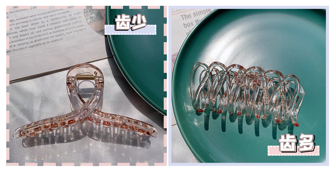 还有一些亚克力串珠式抓夹,也是今夏的大热门,毕竟清清凉凉的质地和颜色,跟夏天最般配了!