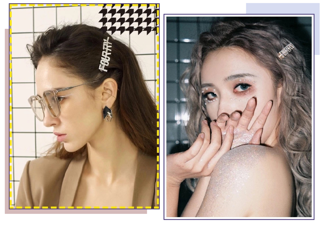 像前几年大热的彩色发夹、泫雅风小发夹已经功成身退了!取而代之的是各种长方形blingbling的slogan发夹。