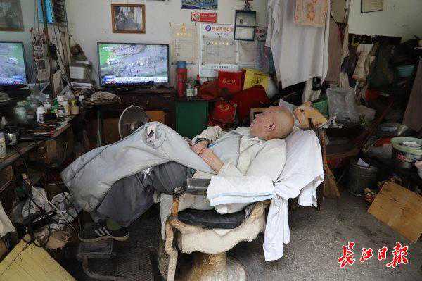 庆新理发店坐落在崇仁路与汉正街交会处附近的义烈巷旁,生于1929年的黄文祥,18岁时为了长久生计,开始学习理发这门手艺,他是这家店的第一代学徒,做发型师75年,称得上是武汉最老的理发师。老师傅坚持每天早上8点就到店里,下午5点下班,没有顾客时,老人就坐在理发椅子上看电视休息。