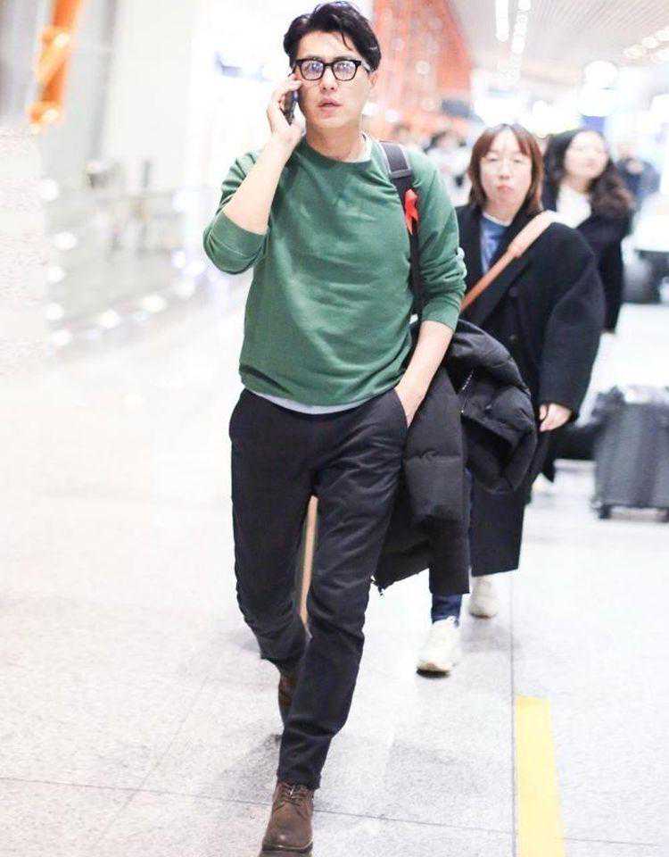 靳东身穿绿色卫衣叠穿白色T恤,下半身搭配小黑裤和棕色皮鞋,丰富造型层次感的同时也凸显了腿部线条。