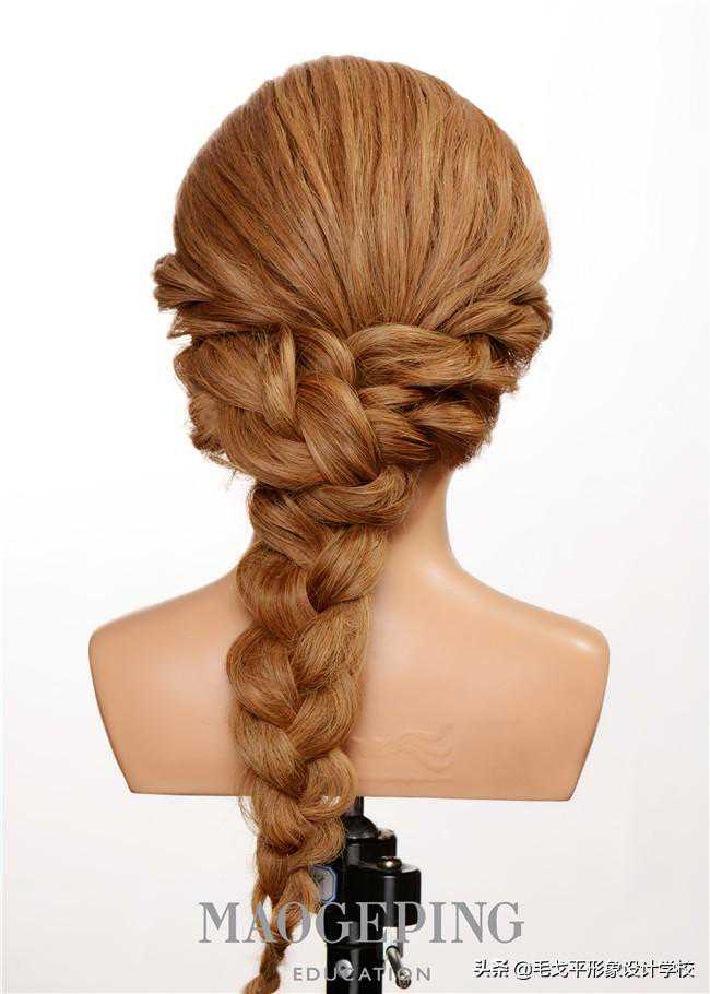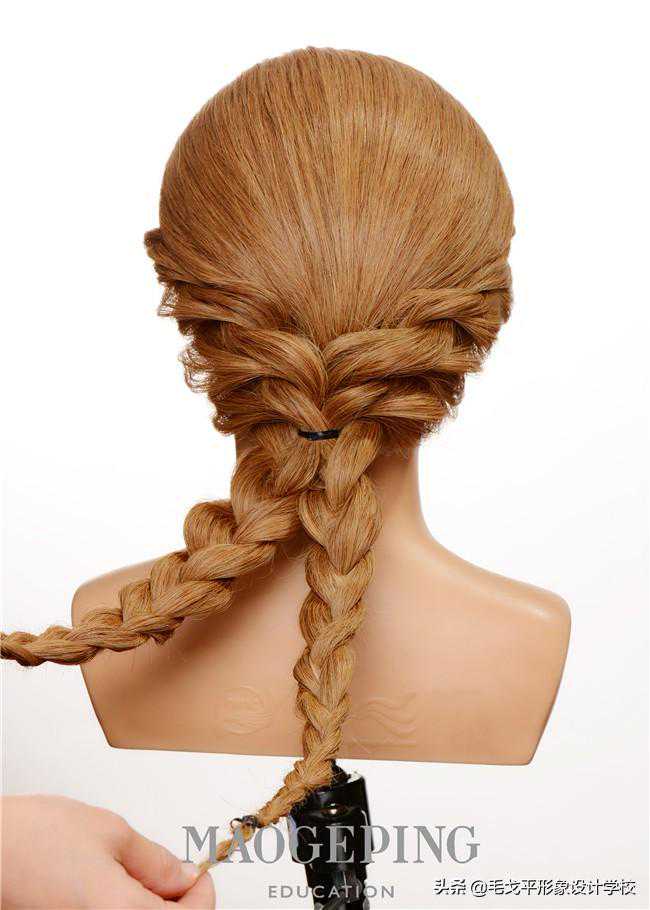 STEP7:将两边的头发分别编到发尾用橡皮筋固定。三股辫的头发纹理微微拉松。