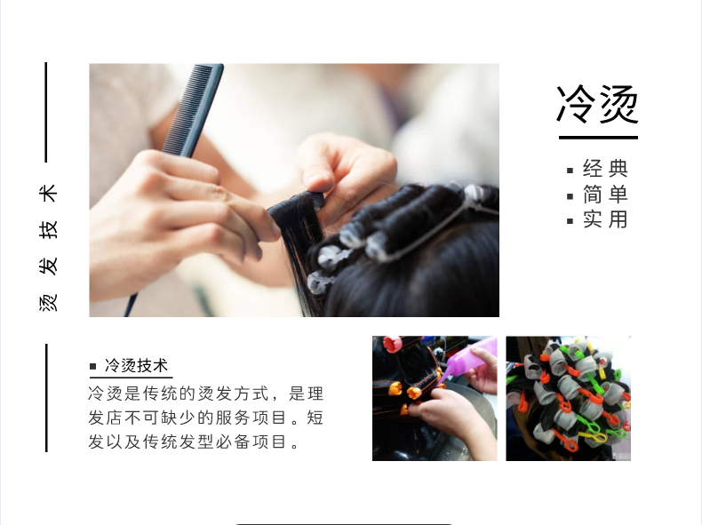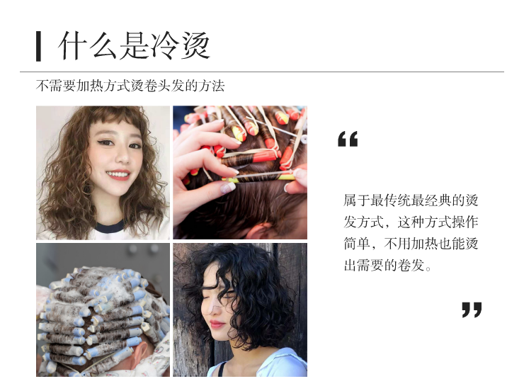 冷烫属于最传统最经典的烫发方式,这种方式操作简单,不用加热也能烫出需要的卷发。几乎每一家理发店都离不开这种传统的烫发方式。因为很多发型只有冷烫有才能烫出来。