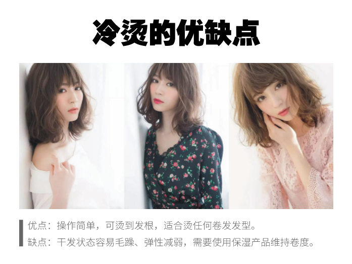 冷烫最大的优点就是可以最大化烫到发根,可以烫出极小的卷发。也可以从发根一直烫到发梢,几乎适合所有的发型。头发潮湿状态卷度弹性光泽度非常好,日常只需要涂抹弹力素等造型品,就能获得不错的发型效果,打理非常简单。冷烫的缺点头发干后有点毛躁,卷度弹性减弱,卷曲效果不明显,不适合烫较大的微卷类的发型。冷烫后发型必须使用保湿类的造型品打理,发型才能获得比较好的卷曲效果。