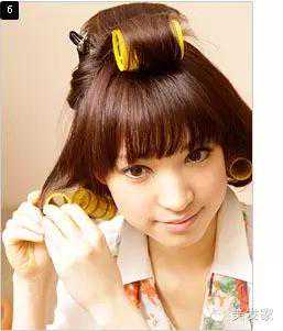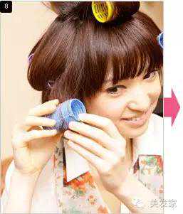 6、侧头部和后头部的头发分成两层,自下而上地卷上卷发器。用略细的圆筒型卷发器从发梢处开始向内卷起。脸沿线的头发只留下1个发束不用卷发器。