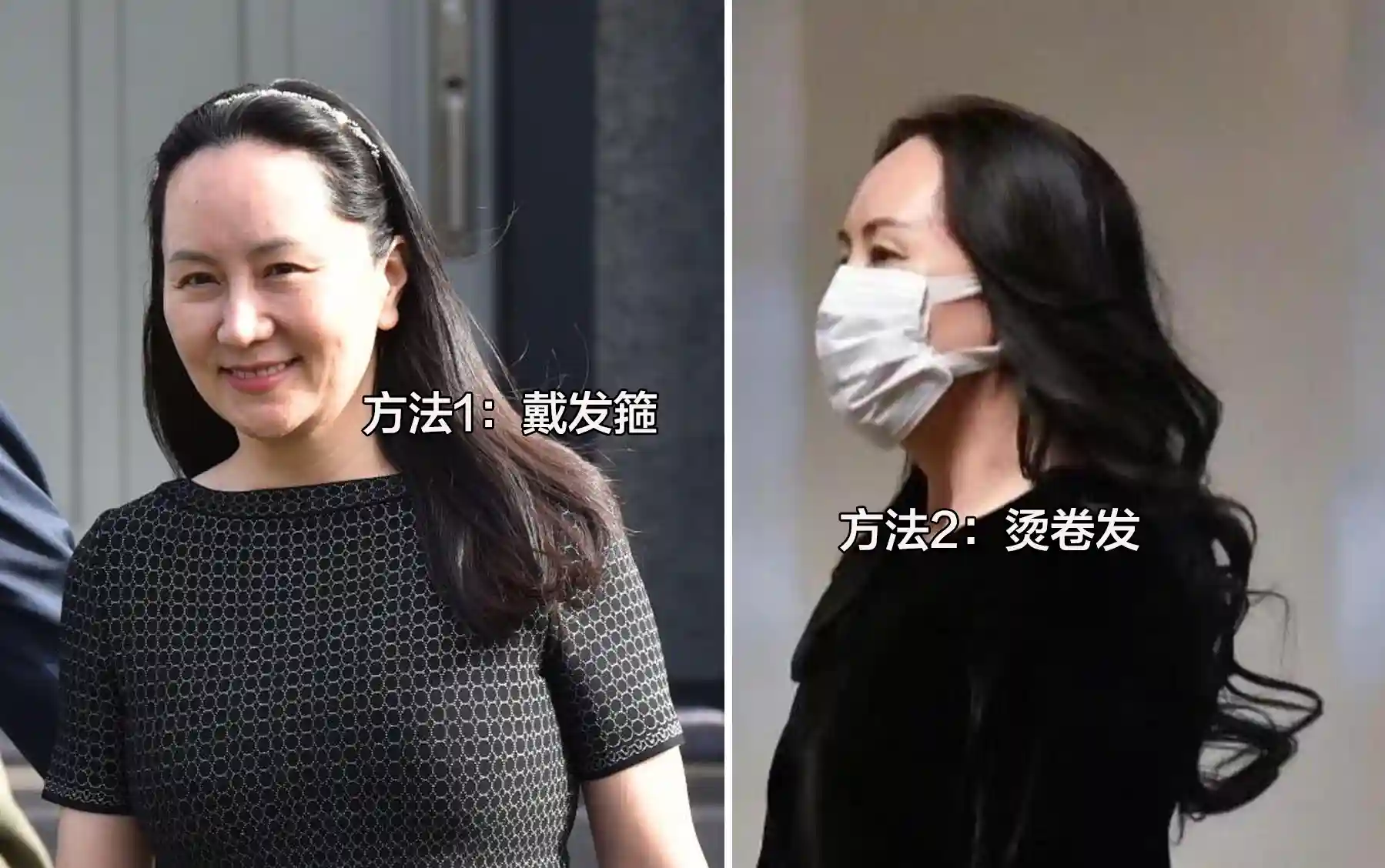 如果选择长直发高发际线也容易显得“秃”,孟晚舟女士的发际线其实就偏高,但她她依然选择长发,其选择长发有两个细节是值得我们借鉴的。