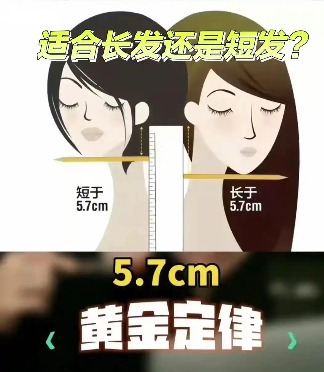 英国著名发型师GilesRobinson:通过测量耳垂到下巴的垂直距离来判断脸型是否适合短发。如果这个距离小于2.25英寸(约5.7厘米),则适合短发;如果大于2.25英寸,则更适合长发。