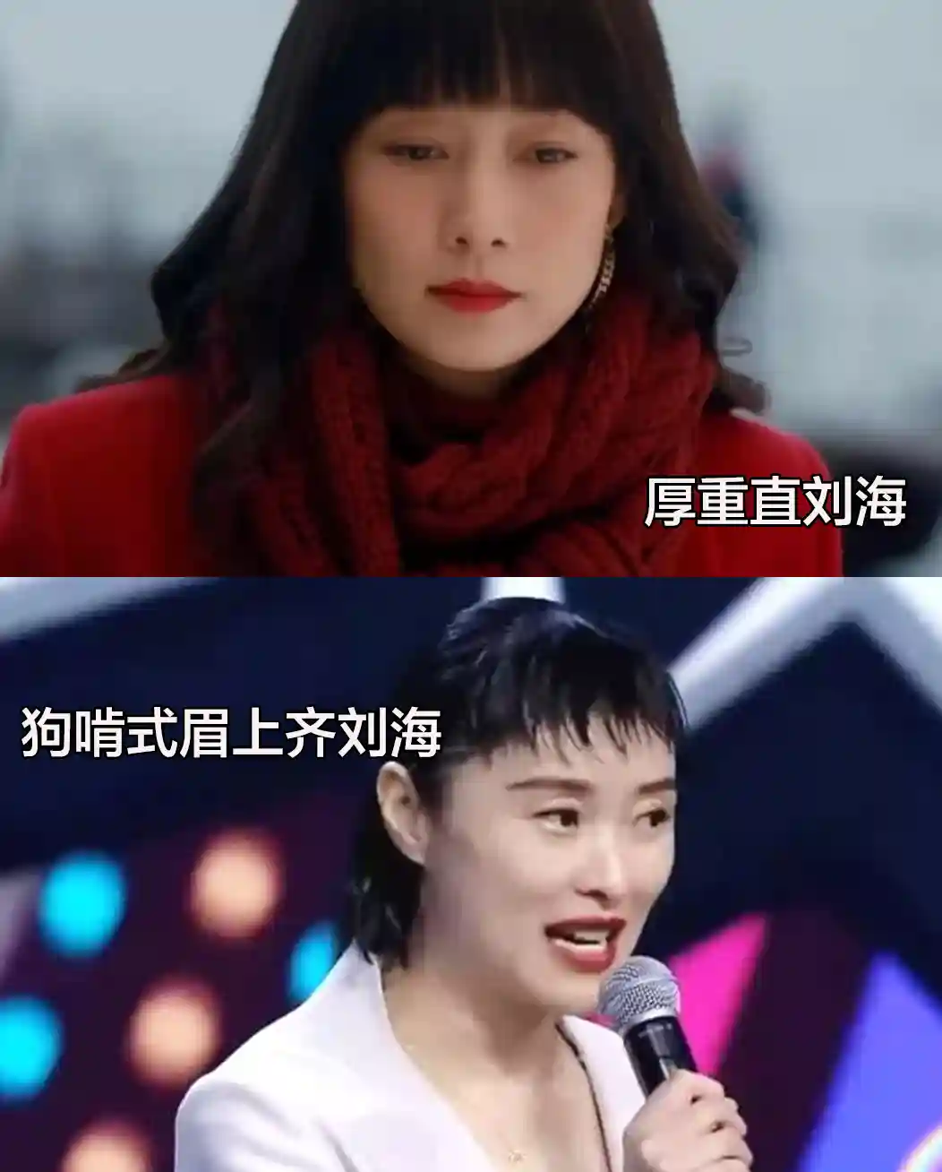 无论是这种厚重的一刀切直刘海,还是自带油光的狗啃式眉上齐刘海,对于中年女性来讲都不友好,驾驭率极低,暴露面部缺点,显得脸大相当违和。