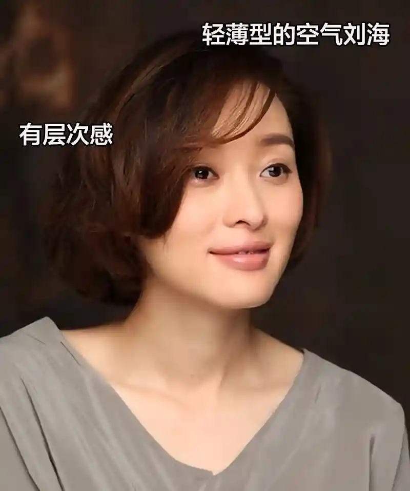 对于中年女性选择刘海,一在于展现发量,二在于修饰脸型,那便要学会营造出层次感的刘海,一刀切的厚重刘海做一些“减法”,对于中年女性反而更优雅减龄。