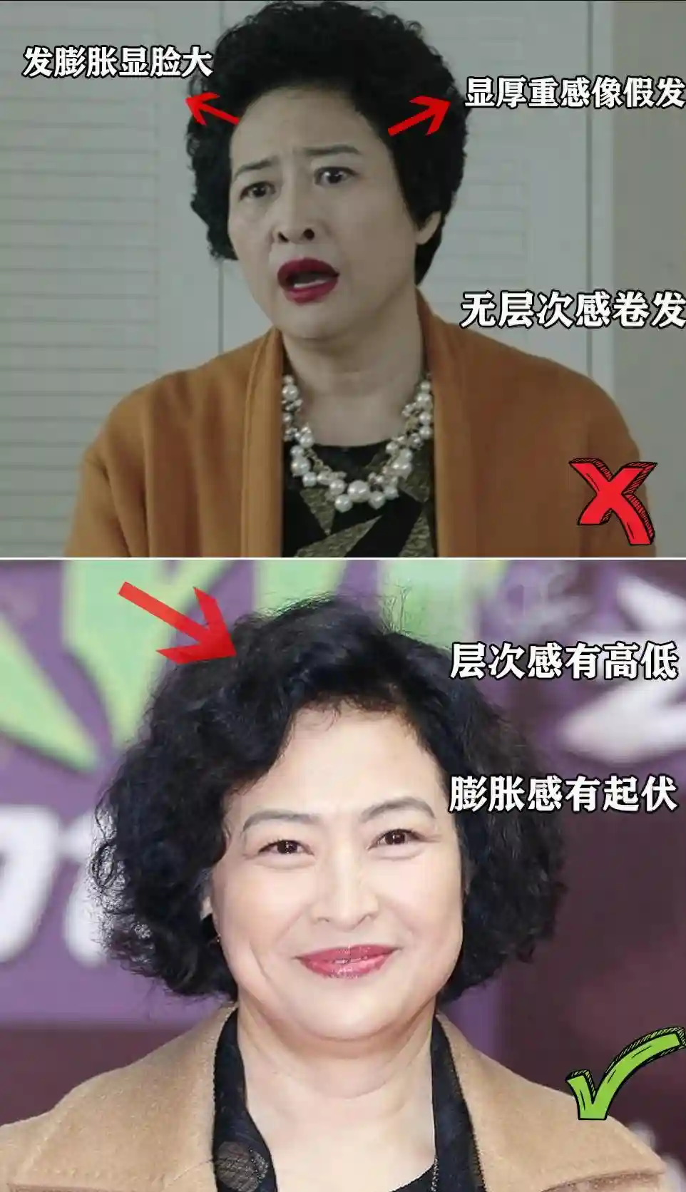 比如对比这张泡面的卷发造型,由于卷发的密度太小,看起来像是假发,也容易视觉膨胀显脸大。因此,还是卷弧更大的一些的发型更显年龄,搭配起来也更不容易踩雷。