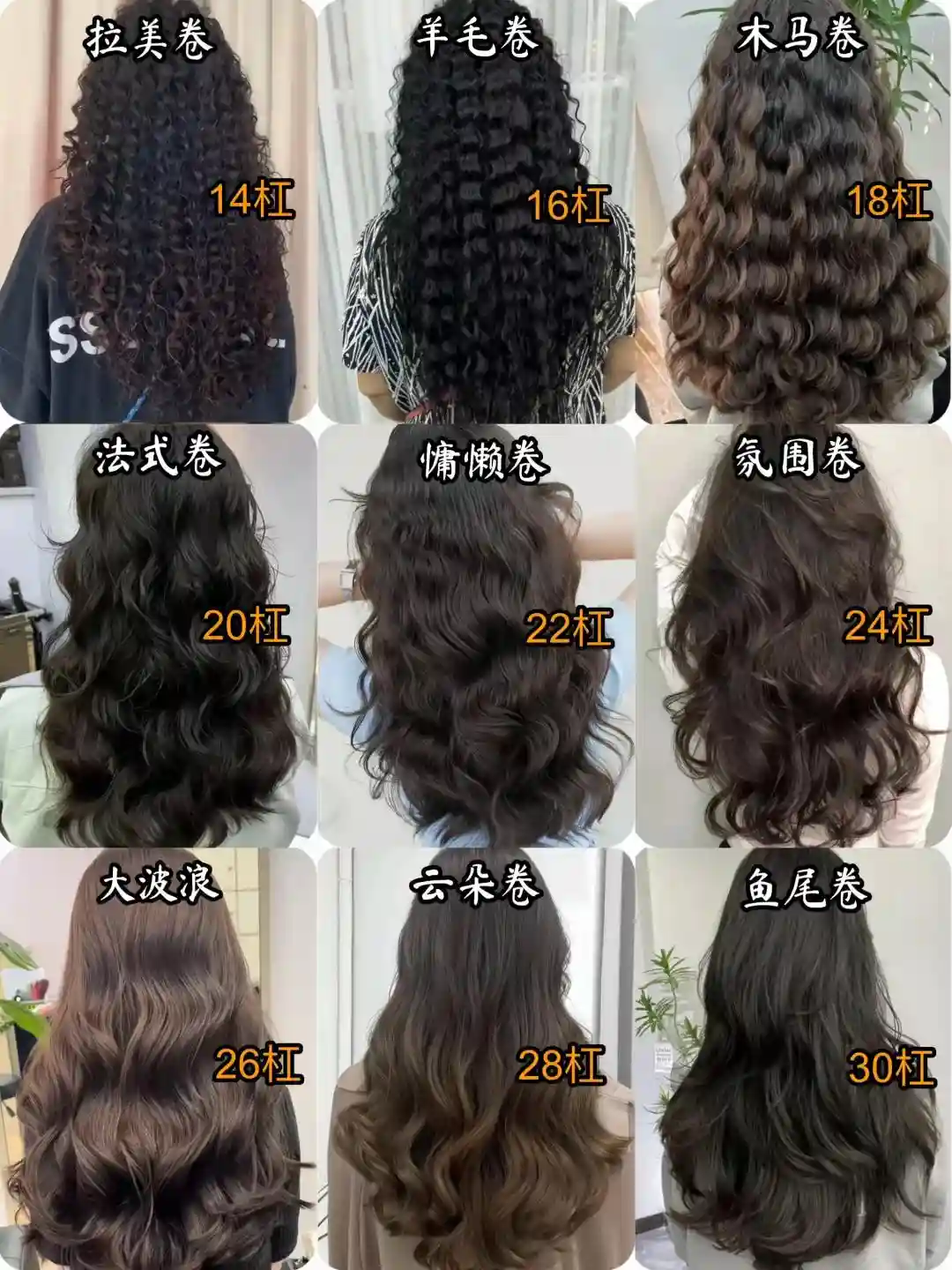 从14号卷弧~30号,分别代表不同的卷弧,而前面我们提到的泡面卷弧度杠数为14杠。若想要视觉上的减龄,选择长发的杠数20~30,选择短发则以20~24杠为最佳弧度。