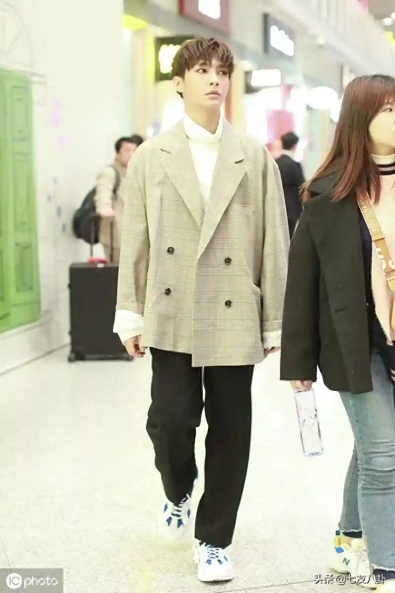 下搭黑色西裤混搭风穿搭使整体毫无违和感,真不愧是时尚教科书,整体帅气有型男神气息满屏,再配上一双小白鞋青春有感增添少年感;
