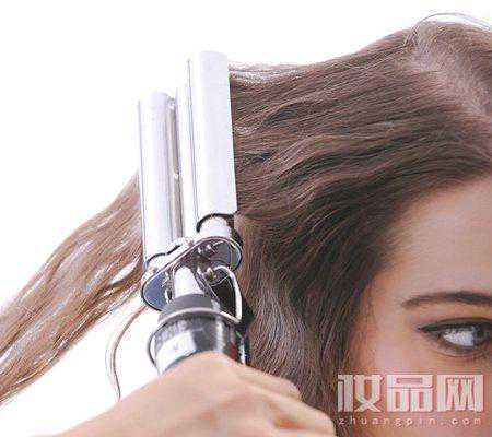 先用卷发棒将头发夹曲以增加丰盈感,头发的中段部分可以制造出比较大的波浪卷曲度,令头发更有层次感。