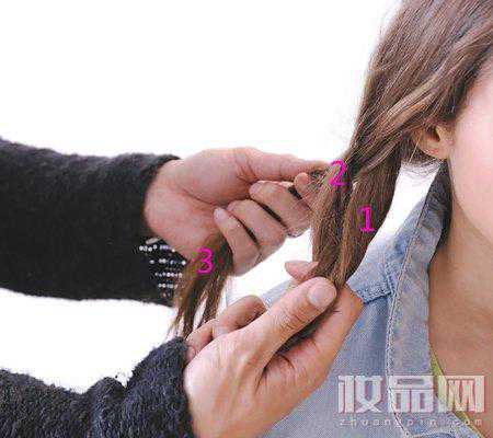 按照三股辫的编法,向右下方进行斜编发。先将辫子1叠在辫子2上,然后辫子3叠在辫子1上,编1次后(即简单的麻花辫),再从发际边缘抽取一小束头发,左右轮流加入辫子中。