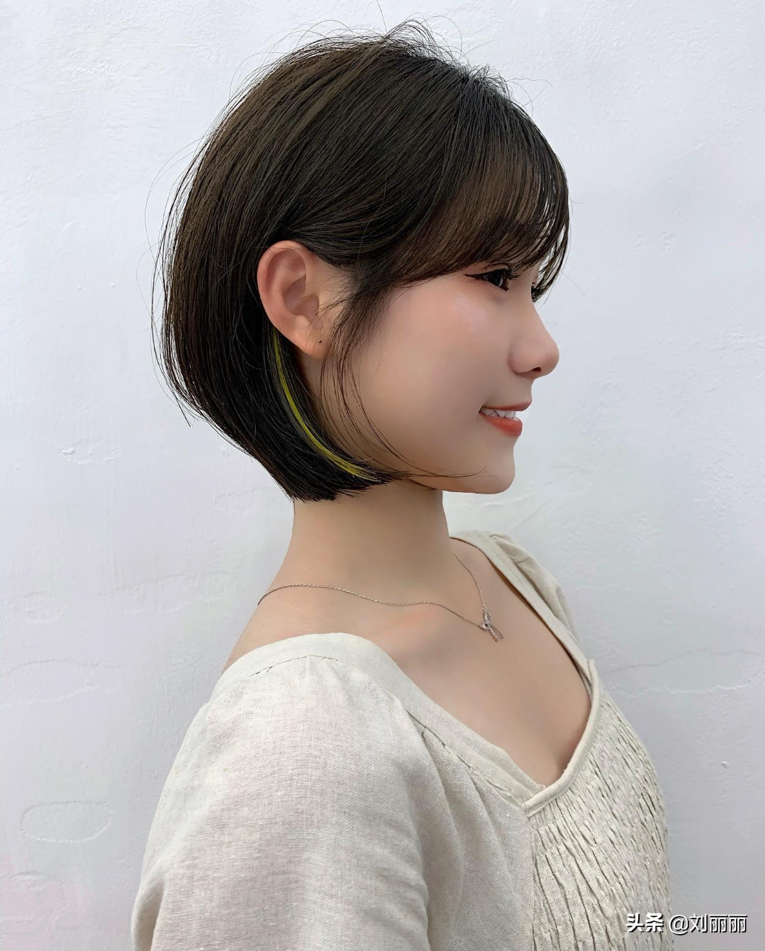 看似一款普通的波波头,当鬓发挂到耳后的时候,我们会看到一束浅绿色的挑染,立马增加了整个发型的时尚度,很美很高级。轻柔自然的法式刘海很修颜,可以弥补发际线的不完美。