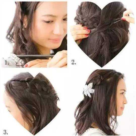 侧面脑后的头发编成别致的辫子,再用水晶发夹点缀起来,华丽高贵。