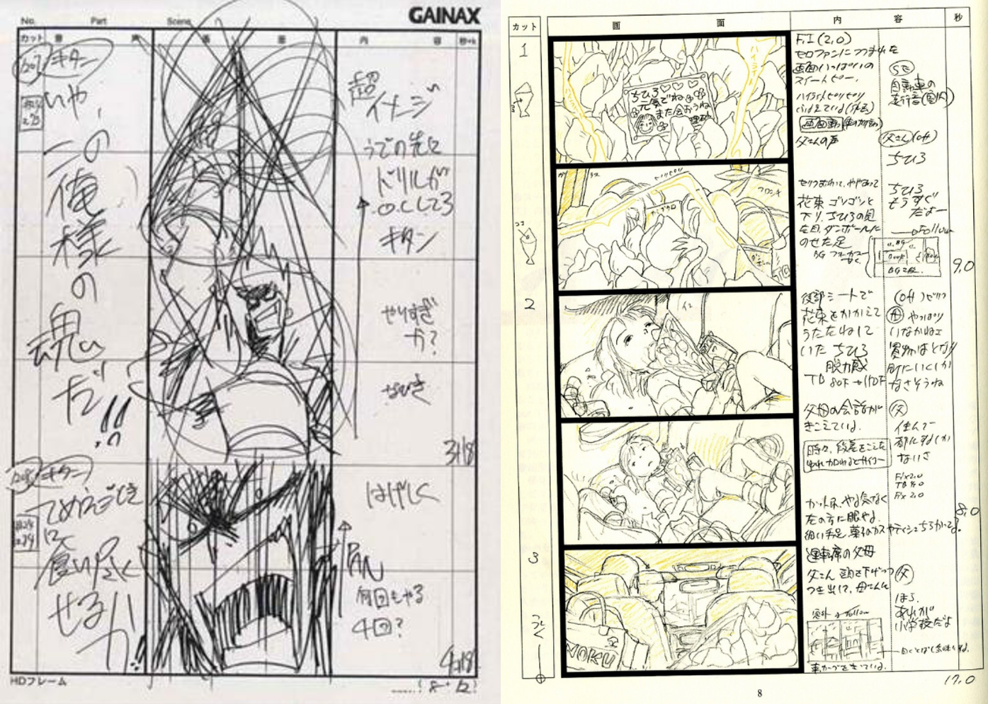 我们可以把layout看做分镜的细化,也是从分镜到原画的过渡阶段。以《千与千寻》为例,分镜、Layout与成品的关系一目了然。