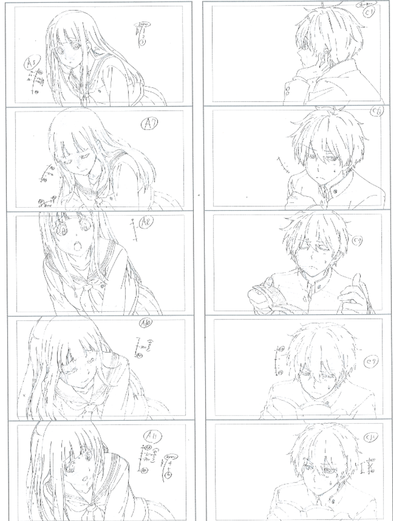 另外再看《冰菓》的这个案例,这里体现的是分镜与原画的关系,一个镜头往往对应着多张原画,分镜没有必要画出过渡动作,只需对动作的方向和幅度做出指示即可。