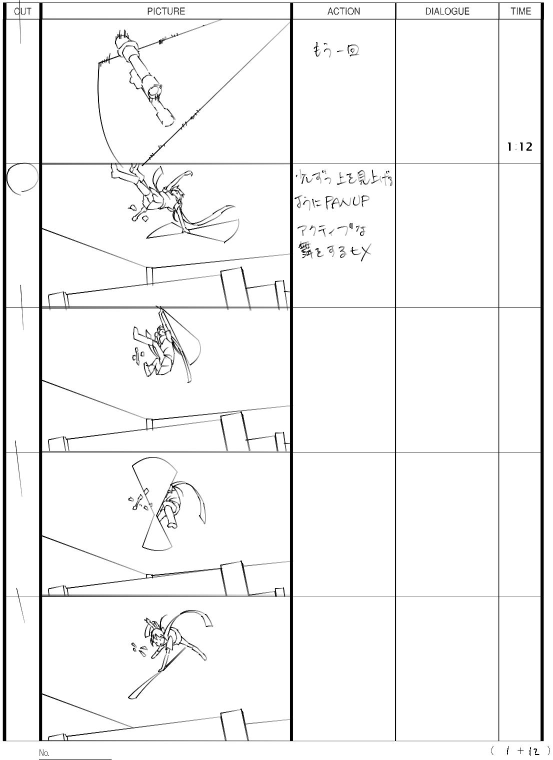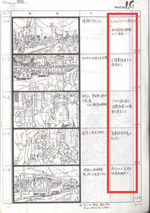 不同的动画公司使用的分镜格式不尽相同,有时会根据使用习惯而改变。比如京都动画、Gainax、吉卜力的分镜用纸就各不相同,但不管怎么变分镜的五大要素都是必不可少的。下面就来逐个解释一下这些要素的含义: