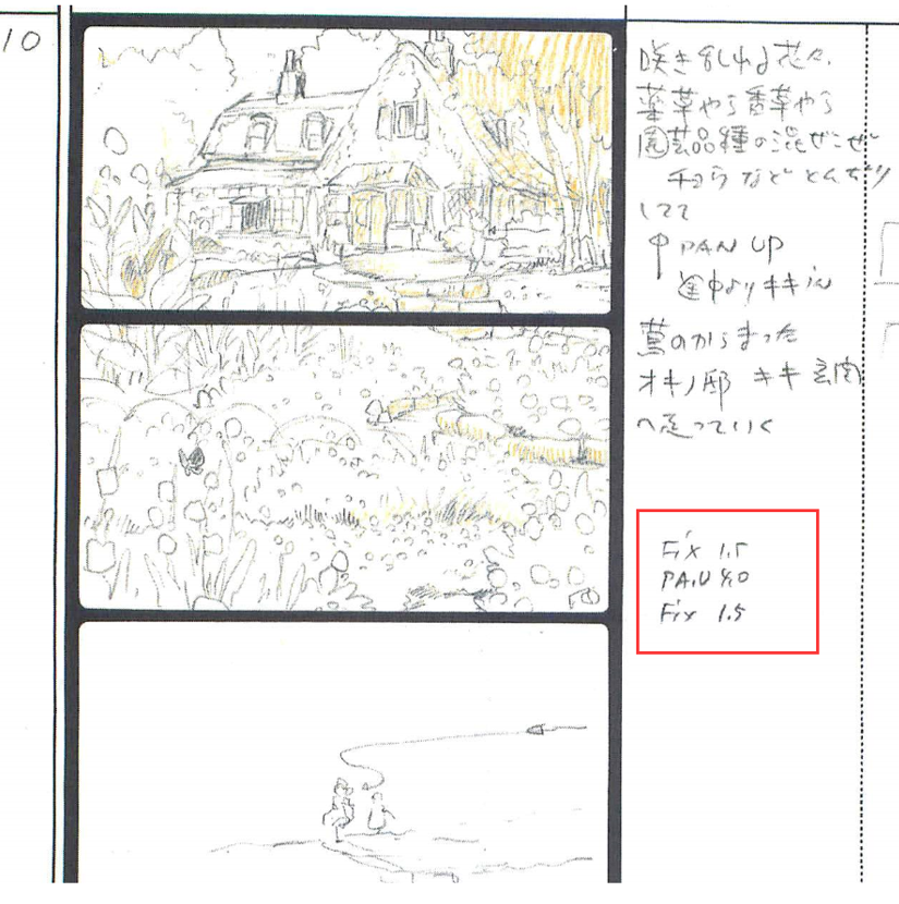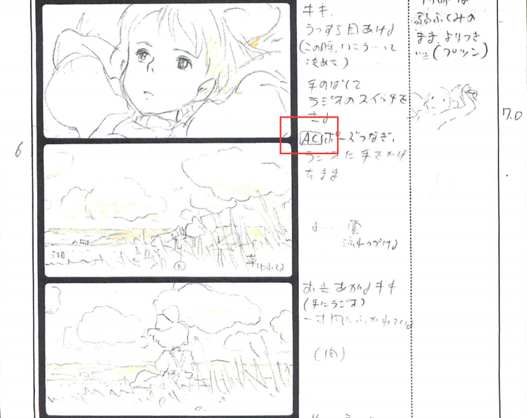 这里主要解释一下AC。这个指示的全称是“actioncut”,当在分镜上出现,就说明导演要着重强调两个镜头之间动作的连续性。比如《魔女宅急便》第一幕的这个场景,第一个镜头女主向后伸手拿收音机,镜头改变之后,女主的动作是接着上一个动作继续进行的。