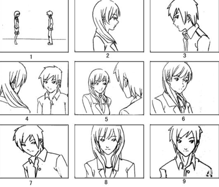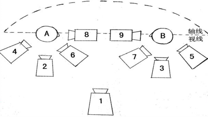 1关系镜头。2、3人物中景。4、5局部关系镜头,过肩镜头。6、7正反打镜头。8、9骑轴镜头。