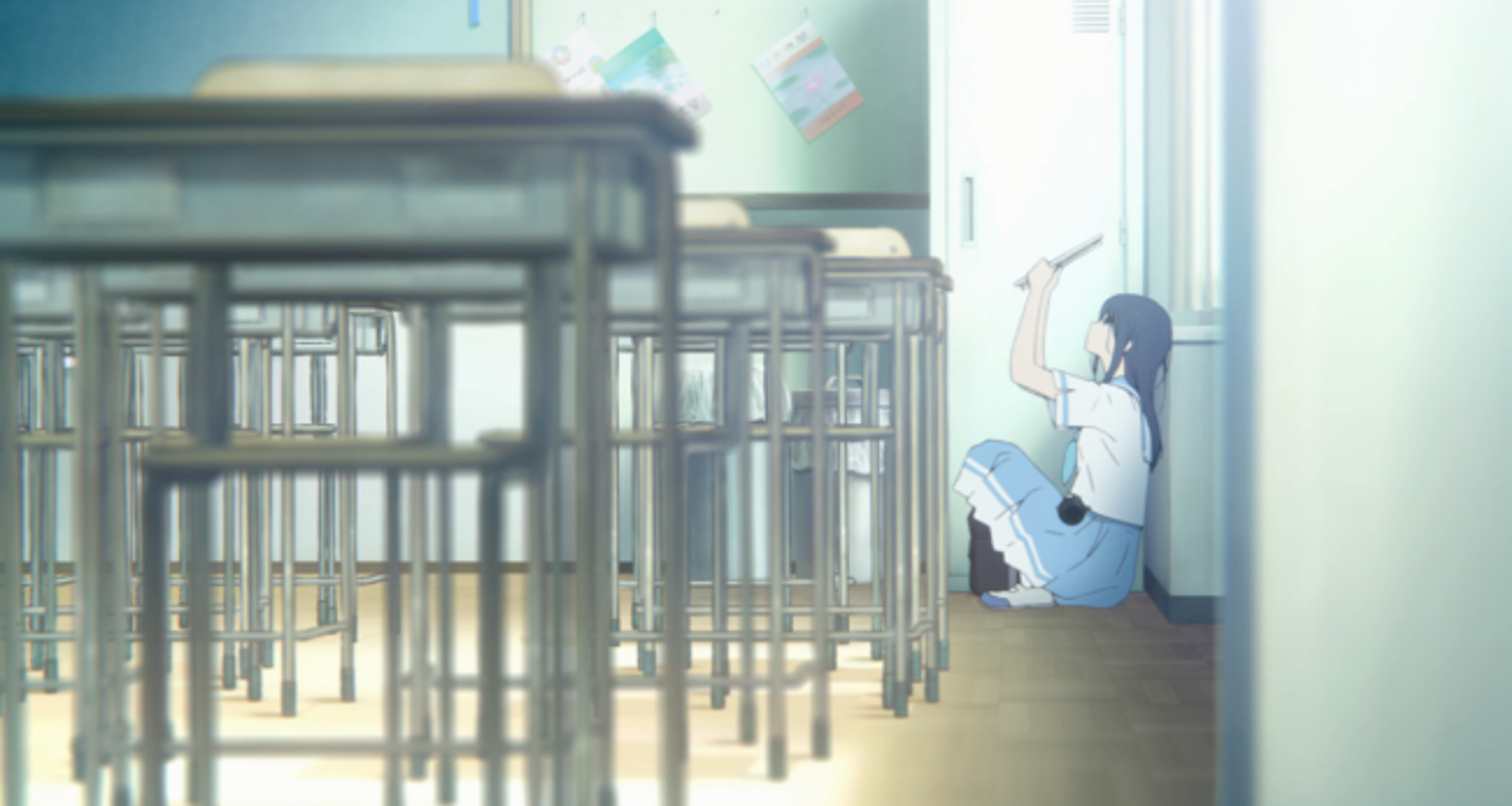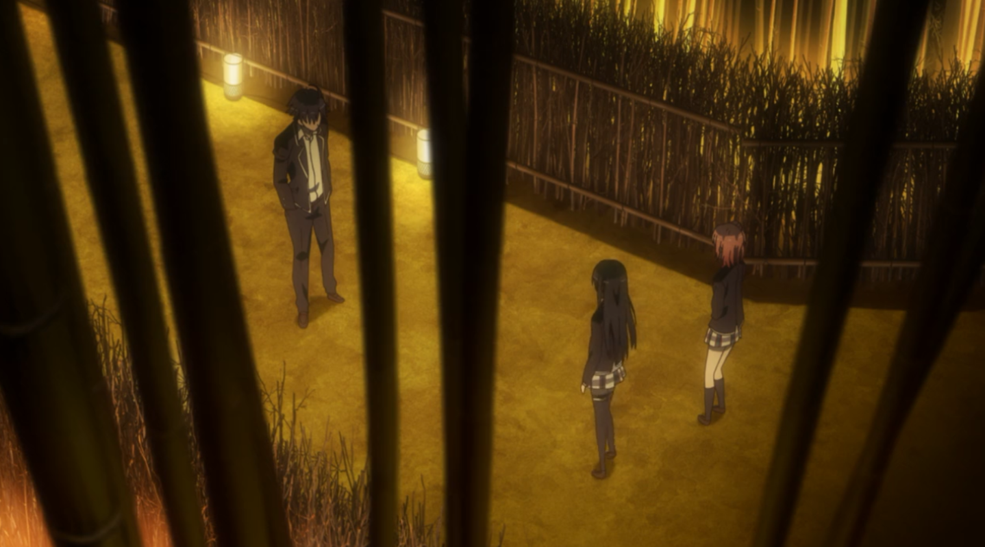 构图类:还是直接来看案例吧,首先是《我的青春恋爱物语果然有问题》这个镜头加入了前景,将人物分割开来。如此大面积的前景本身就具有一定的制造压抑感的效果,阻断的空间也暗示了人物关系出现了隔阂。
