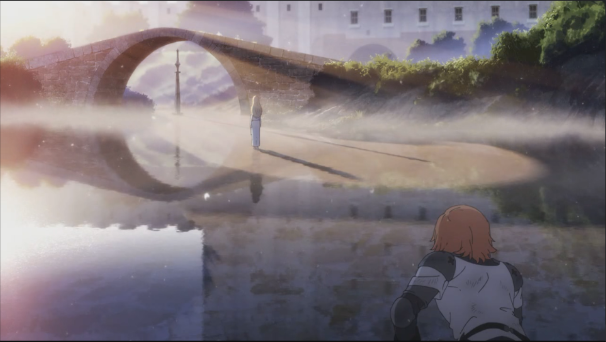 再比如《朝花夕誓》中的这个告别的镜头,这个场景是美术监督东地和生亲自设计的,他也解释过自己的设计意图。拱桥和尖塔的倒影形成了一个钟表的形状,象征着让两人分离的东西是“时间”。故事中的离别一族寿命是400年以上,随着时间的流逝,他们总是在不断地与珍视之人离别。