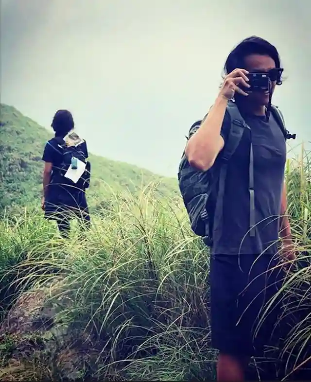身穿休闲服的彭于晏一手拿着相机好像在拍什么,但其实殊不知彭于晏自己就是一副美好的景象。虽然穿着很简单,宽松肥大的T恤和短裤搭配到一起反倒显得随性洒脱。