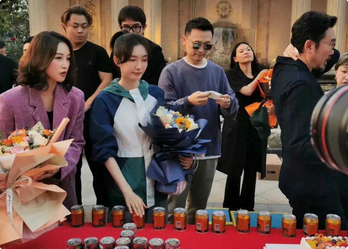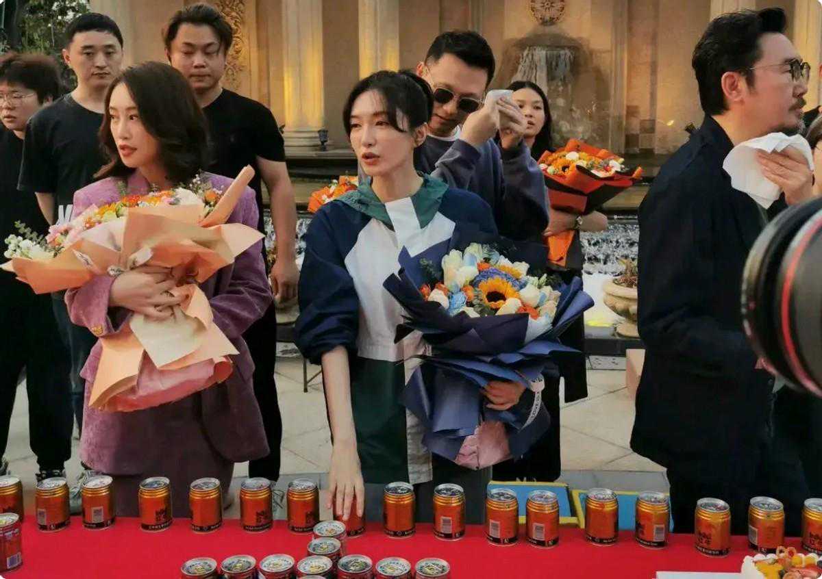 在杀青宴上,江疏影穿着一件运动感十足的外套,手里捧花,一边准备拍照,一边和工作人员交流。