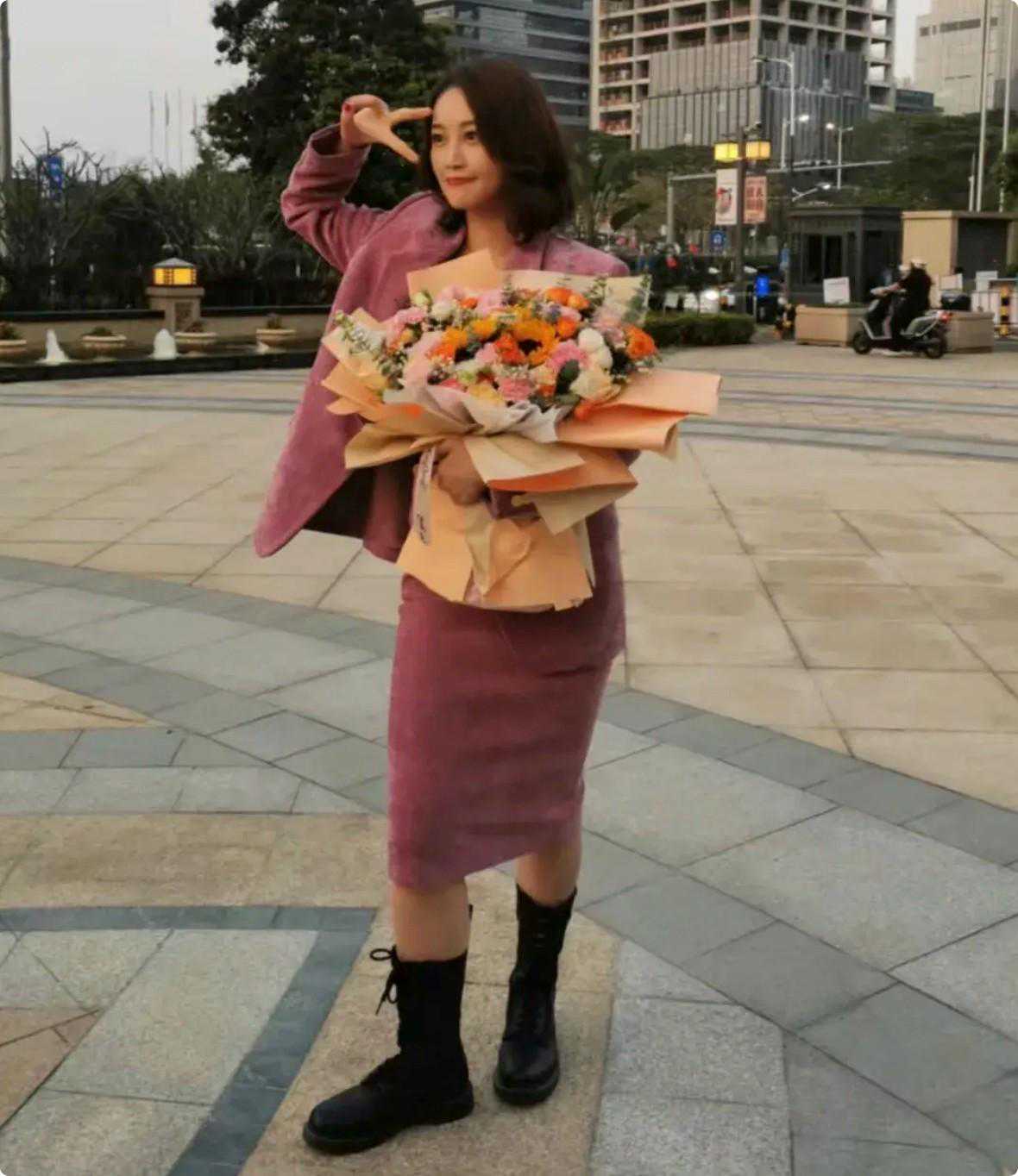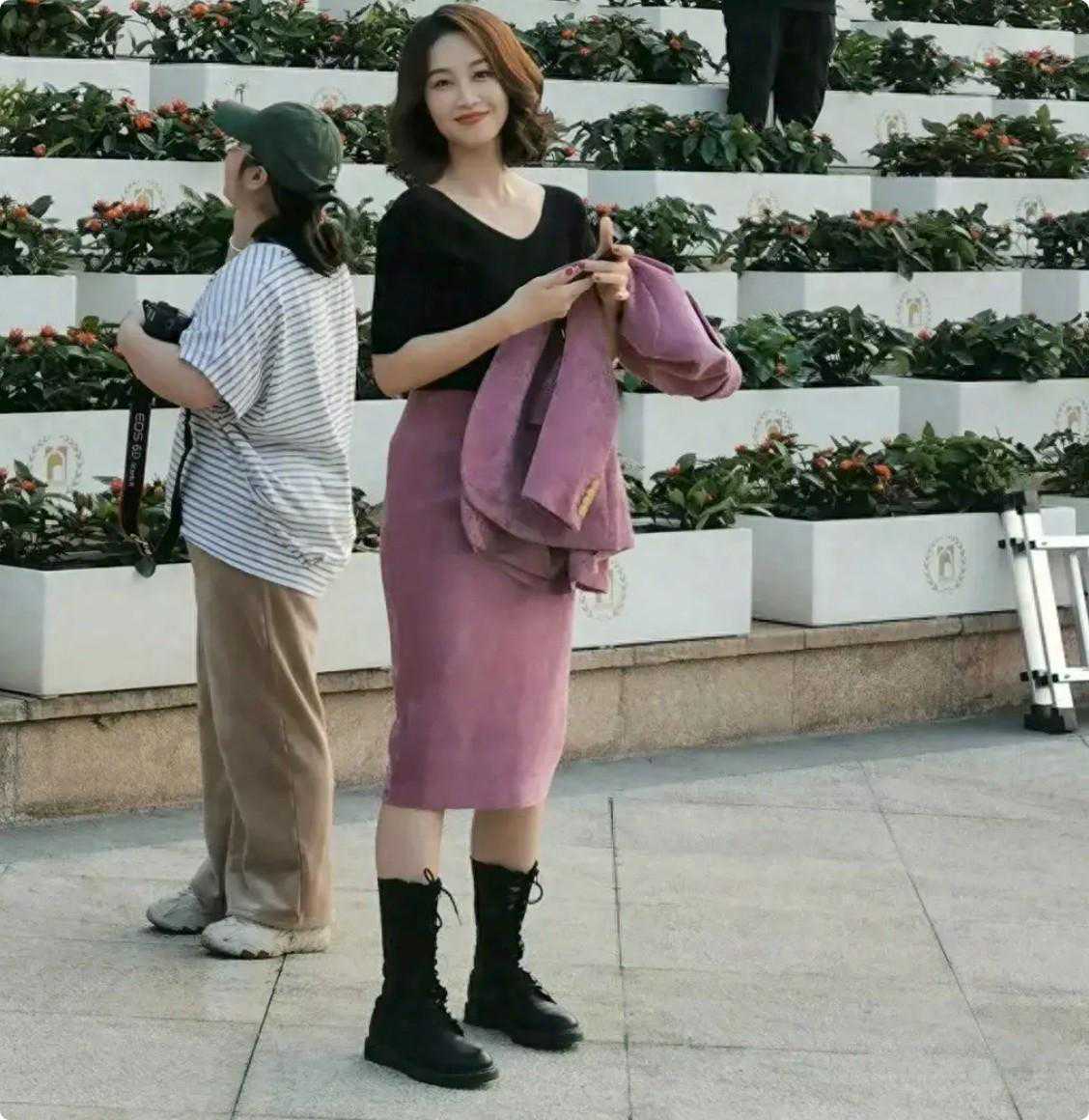 这样的直板身材,要是没有垫胸垫屁股,穿着套装就有种直上直下的臃肿感,这身紫红色的小套装,不显气质,半裙的长度又恰好把蓝盈莹小腿最粗的地方露在了外面,廉价感十足的光腿神器秋裤感很强,在加上一款黑色的长统靴,整个人的比例就更虐了。