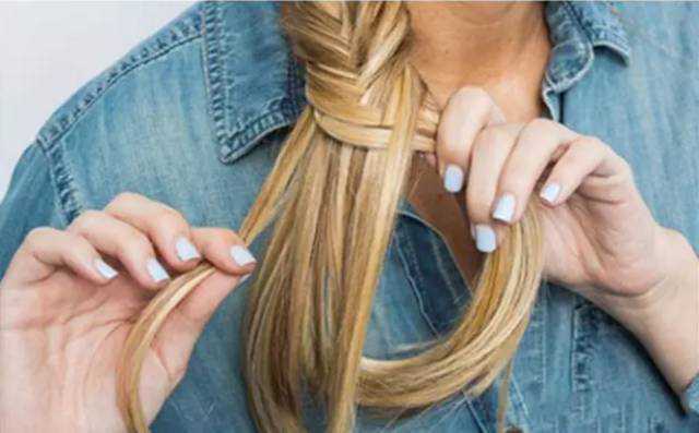 3左右不断抓取细发束编织成鱼骨辫,至发梢捆绑固定,最后,手指亲撤发辫两边,打造出纹理精致又自然的编发造型。