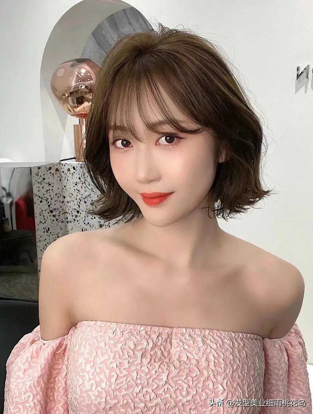 直短发觉得有点单调?那就烫个小鱼尾卷,俏皮可爱又非常显气质,显白的棕咖色真的太适合秋冬季节了,超级温柔。法式浪漫刘海修饰脸型,额头宽的女生一定要尝试的刘海之一,瞬间让你的脸型小一圈。发量少的女生烫个卷更好看显发量,性感的路肩上衣搭配一下,粉粉嫩嫩太迷人啦。