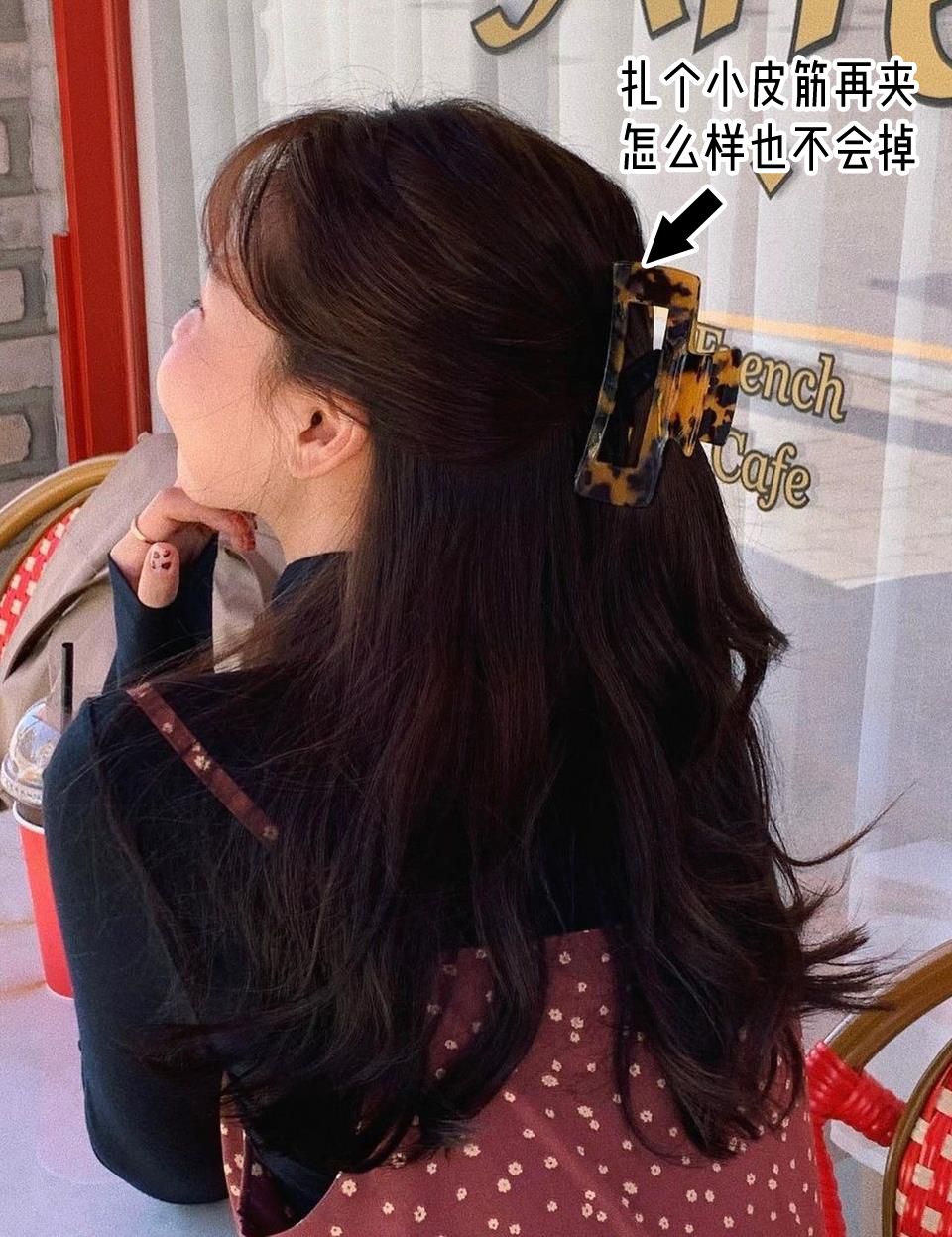 觉得有点轻熟的话,也可以试着用抓夹来一个半扎发,优雅到不行,跟姐妹们在花园里喝下午茶这样扎就很应景了~