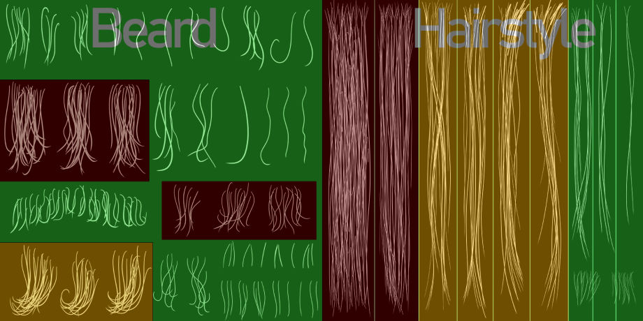 我画了卷发并标记了区域。红色是我将用于第一层头发和胡须的卷发,黄色是第二层和第三层,绿色是最后一层。你可以看到胡须的头发比发型的头发更浓密和弯曲,让胡须显得缠结和浓密。