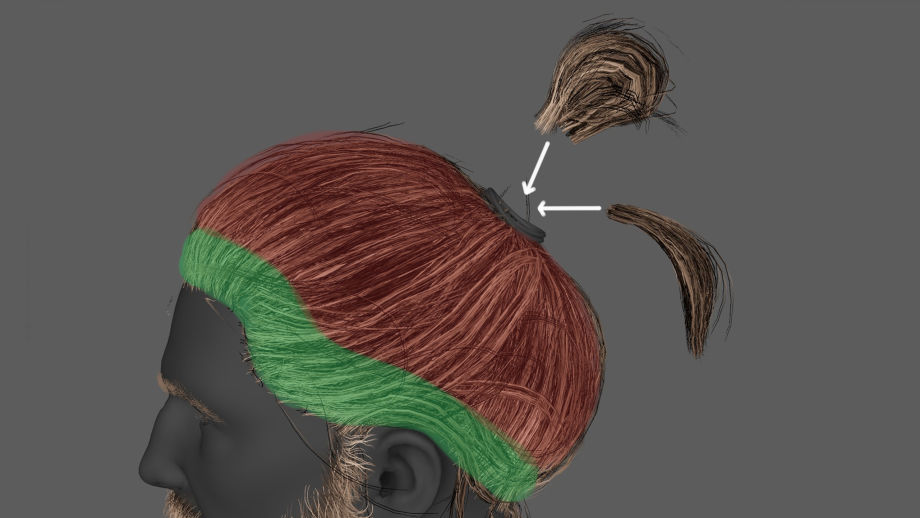 第二个技巧是我只沿着生长线放置卷发。由于在这种发型中,卷发相互重叠,我只将卷发放在绿色区域。红色区域没有头发。在最后的镜头中,发型看起来很丰满,看不到镂空。