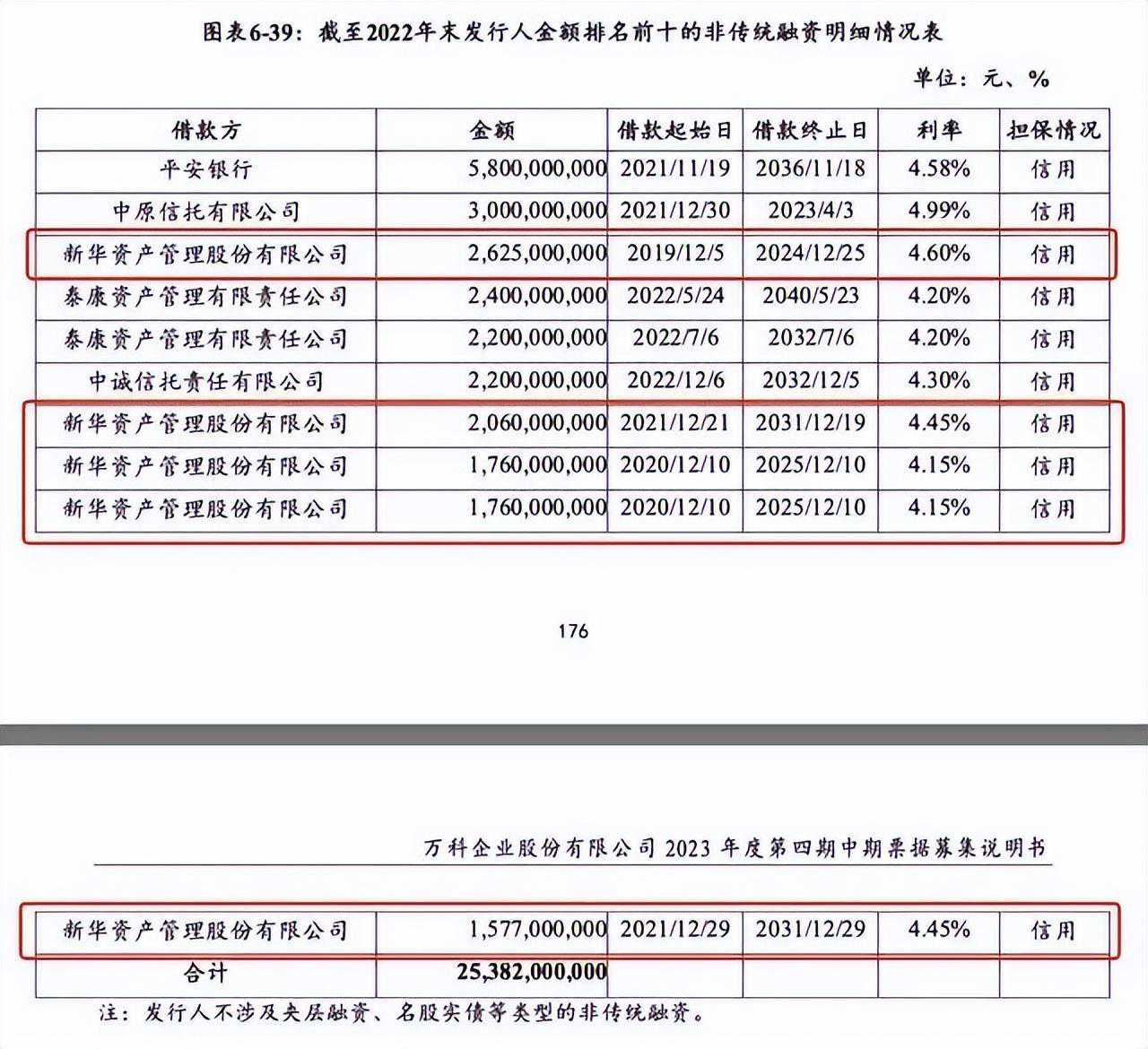 另据万科2023年度第四期中期票据募集说明书显示,截至2022年末,在万科发行人金额排名前十的非传统融资明细情况表中,新华资产就占了5位,合计借款金额约97.82亿元,其中借款起始日最早一笔为2019年12月5日的一笔26.25亿元借款,利率4.6%,借款终止日为2024年12月25日。