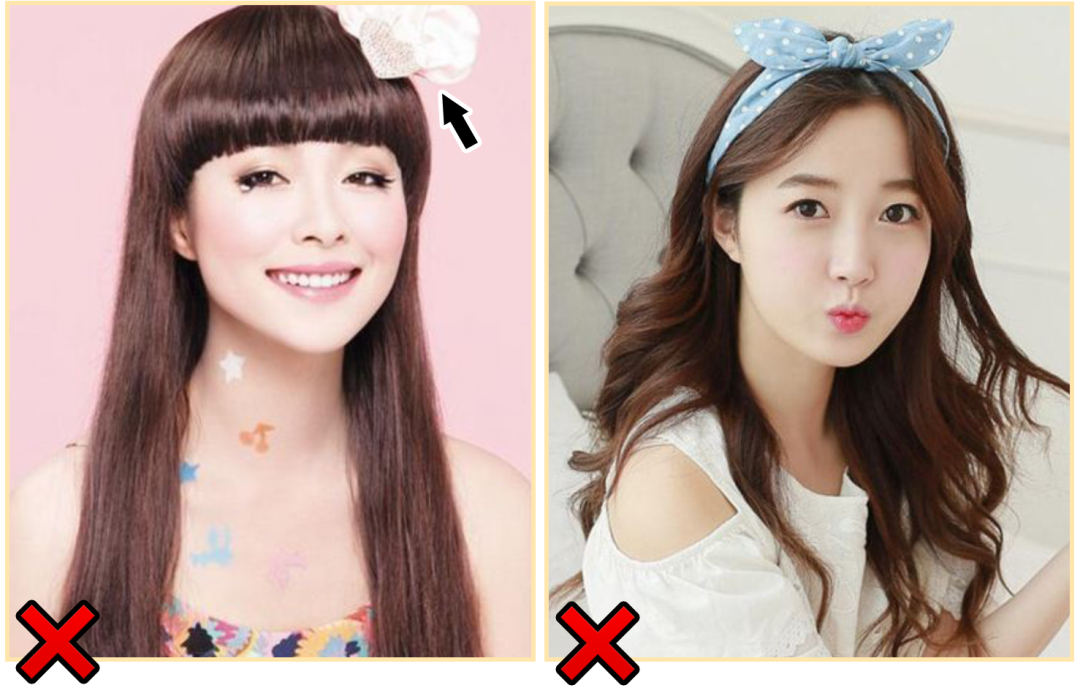 要是尖头、方脸的话,戴头顶就不管用了,会显得尖头更尖。而是把小蝴蝶结别在额头两侧,跟眉眼平行。这样大家的视觉重点就会放在温柔的眼波,可以有效地弱化头型脸型的缺点~