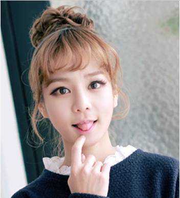 这款丸子头发型清新甜美,高高的丸子头略微松散,几缕发丝垂在脸颊两侧,配上一个空气刘海十分娇俏可人,棕色系的染发让人看着更加白嫩。