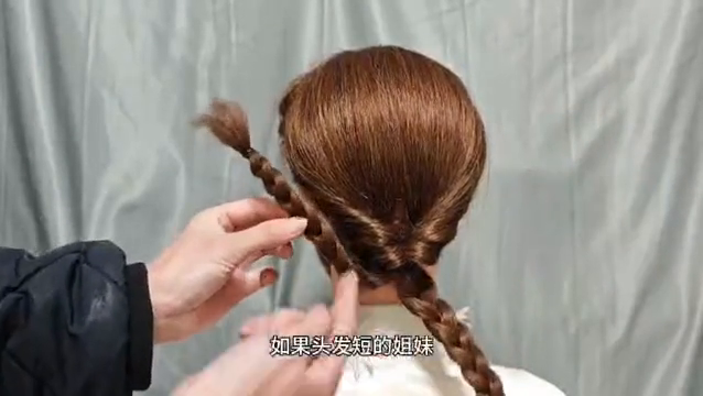 ·麻花辫我想姐妹们都会做,因为编的最早的一股就是麻花辫的,所以都会做。编好了之后拿上皮筋来绑扎固定,拿起皮筋,拿起橡皮筋来给它夹,直接给它绑扎固定。
